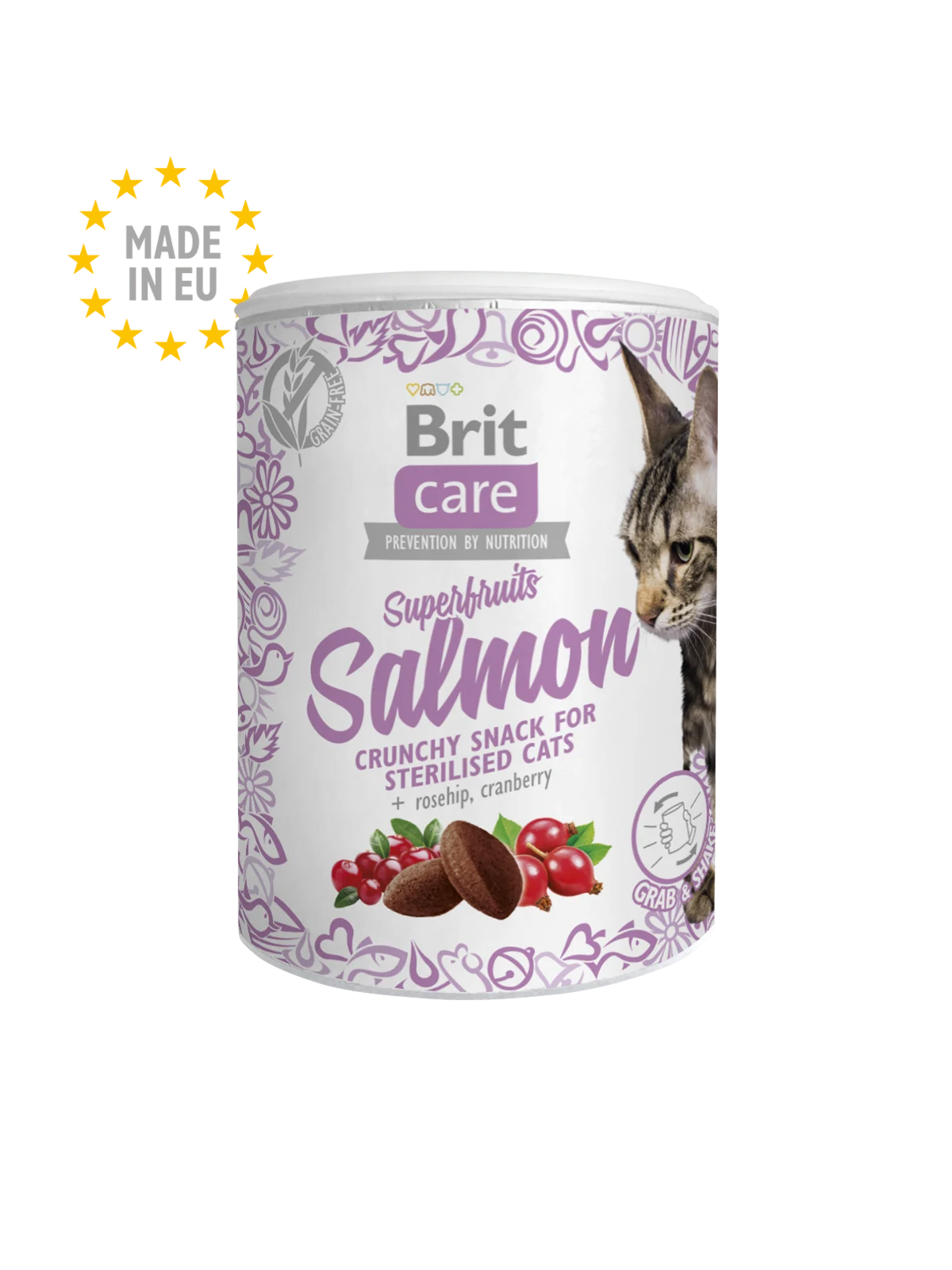 A grain-free superfood snack specially crafted for sterilized cats, featuring salmon, rosehip, and cranberry. A delicious complementary treat for your feline friend.
