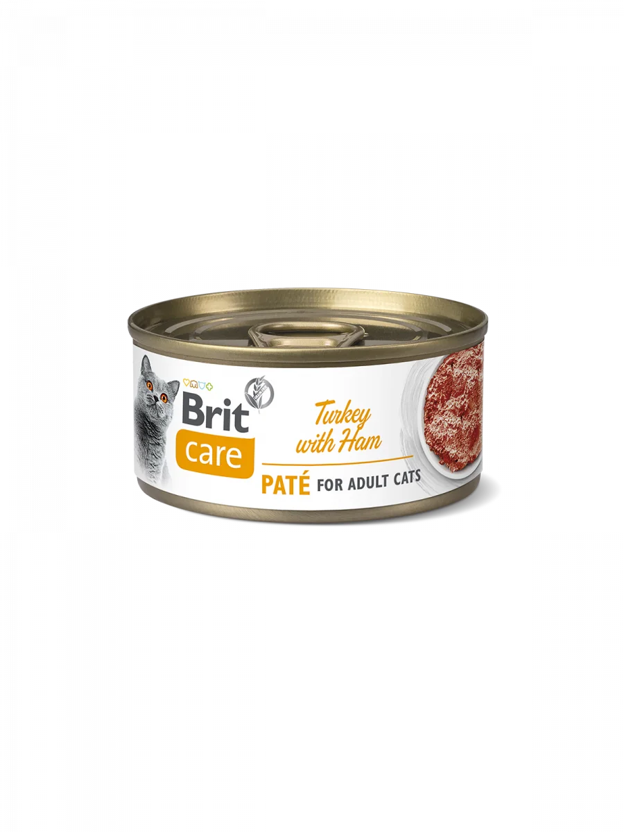 Brit Care Cat Turkey Paté with Ham combines tender fillets and premium meat for a tasty, hypoallergenic meal, free from sugar, gluten, GMOs, and preservatives.
