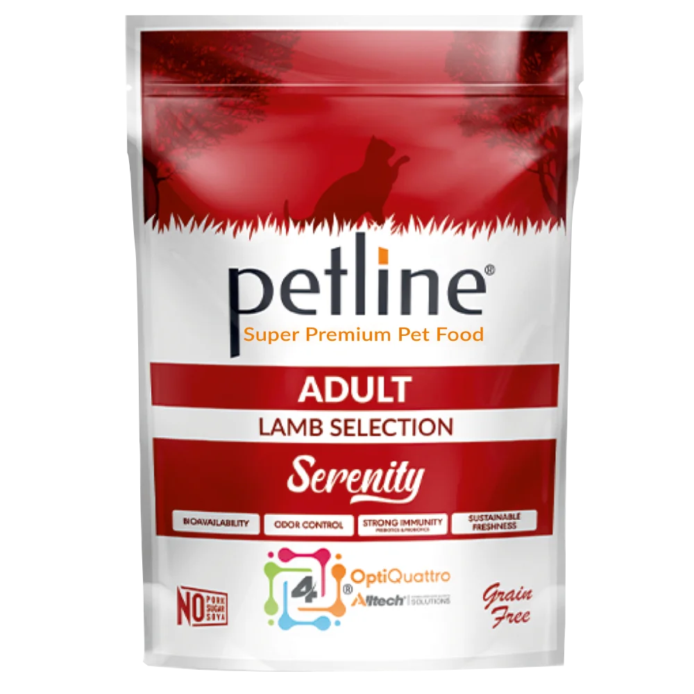 Grain-free wet food with lamb in jelly for adult cats, offering lasting freshness, enhanced nutrient absorption, stool odor control, and immune support with OptiQuattro® technology by Alltech.